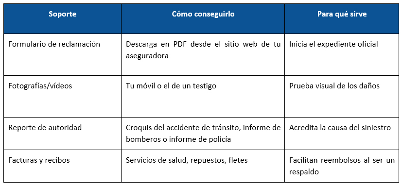Nota: Avisa a tu aseguradora lo antes posible, incluso si aún no tienes toda la documentación. Si llamas sin todos los soportes, normalmente te dan un plazo para reunir y enviar el resto.